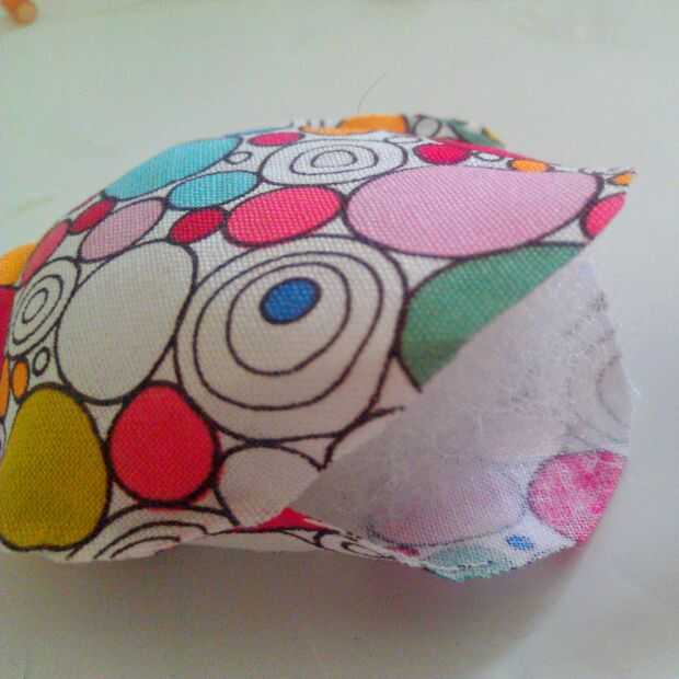 La almohada es muy fácil de hacer. Cortar dos piezas de tela, cerca de tres pulgadas de cuadrado. Recortar las esquinas, para hacer la tela más o menos circular. Poner mal partes de tela junto con el relleno en el medio. Unir los bordes, con el relleno dentro.