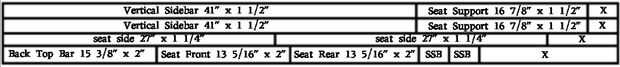 Arrancaron dos tiras en la Sierra de mesa @ 1.5", de la que luego corté dos 41" tableros y dos tableros de 16 7/8". De la chatarra restante cortar dos bloques de 2 7/8" con un inglete de 30 ° en un extremo de cada uno, que se consigue pegado a uno de la placa de soporte asiento delantero 16 7/8" (ver fotos de dos y tres abajo). Luego arrancó una tira de 1 1/4" de la Junta Directiva restante en la Sierra de mesa. Desde que corté dos 27" las piezas en la sierra para cortar ingletes. S después de arrancó la Junta restantes a 2" de ancho y cortar dos piezas de 13 5/16", y un tercera 15 3/8" en el inglete vio. Caso omiso de las piezas cortas en la imagen marcados "SSB".