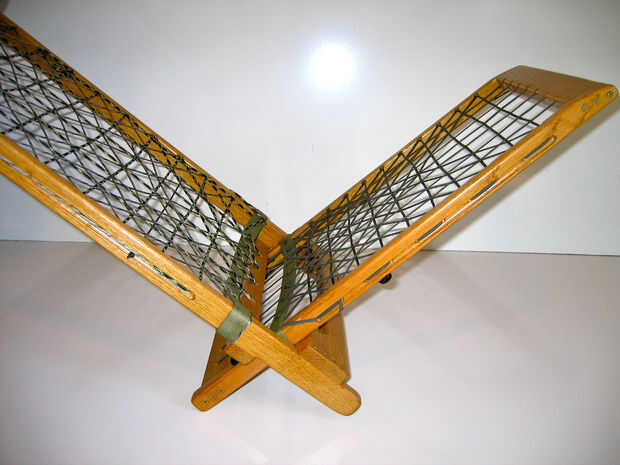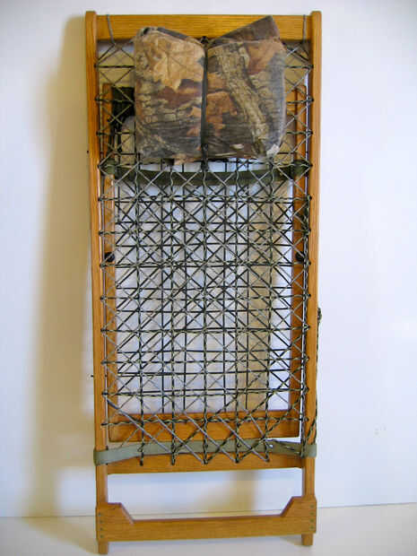 Ahora usted puede perforar cuatro 1/8"(dos en cada lateral vertical) para asegurar el cable de descarga. La imagen de abajo muestra el propósito de la cuerda de choque elástico, que es el armazón del asiento con el respaldo de la silla cuando viaje o estiba. I mis agujeros en 10" y 27" de la parte superior de las barras laterales perforados, el cable de descarga a través de los cordones y atado simple ocho nudos para agujero en su lugar. El armazón del asiento ahora desliza perfectamente en su lugar.