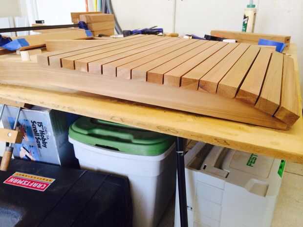 Cuidadosamente el pegamento, o atornillar todas las piezas empezando por pegar todas las tablillas para el asiento y detrás mientras que separados. Después de que hayan secado luego sujete el respaldo y asiento uno al otro y al delantal y rieles de soporte inferiores. Asegúrese de que utilizar bloques para mantener la coherencia de todas las lagunas. Esto es muy importante. Las lagunas será fuera de la alineación si no los utilizas! Cuando todas las piezas están en su lugar, sujetarlos y retire cualquier exceso de pegamento de la Junta. También puede cinta las juntas con cinta de pintor azul. Esto ayuda con pegamento que se escapa la articulación no remojo en las fibras de la madera. Deje que seque durante la noche la silla.