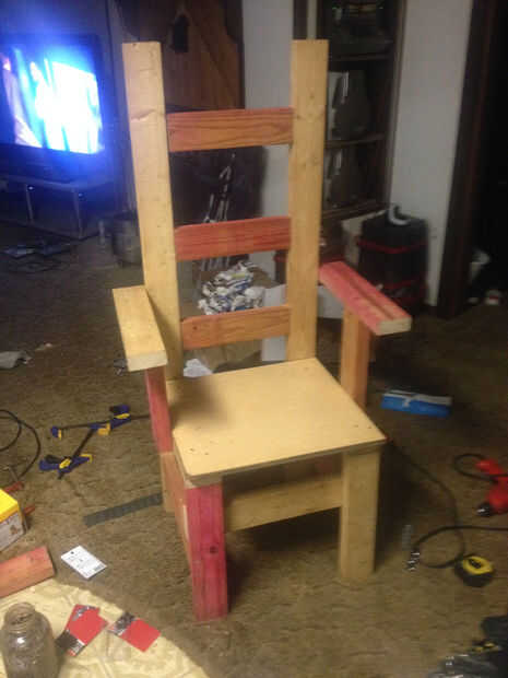 La silla misma estaba hecha de chatarra 2 x 4 que tuve puesta alrededor. Es bastante básica y recta construcción hacia adelante. Después mancharon la cosa entera.
