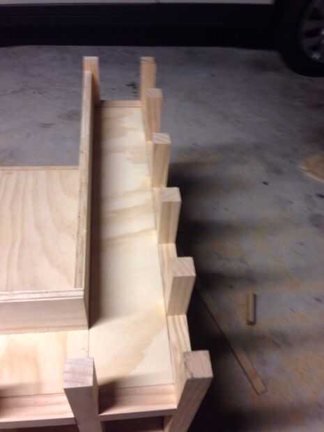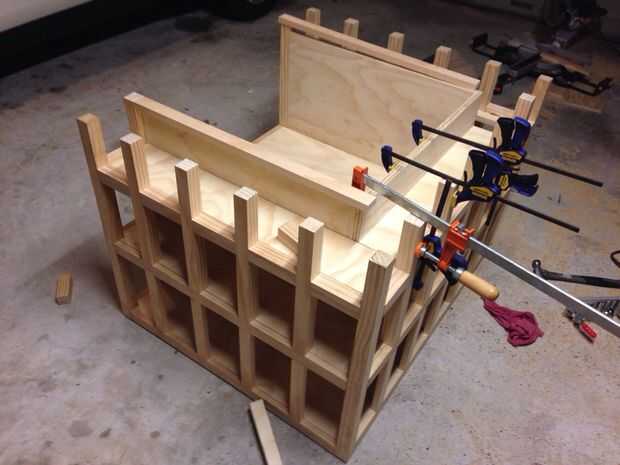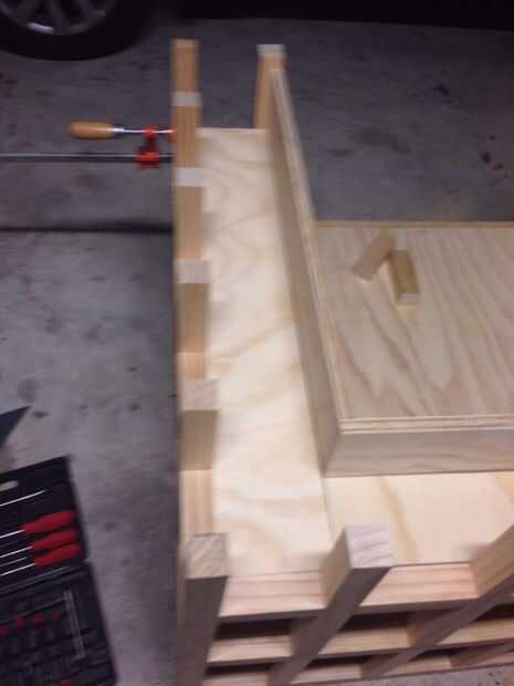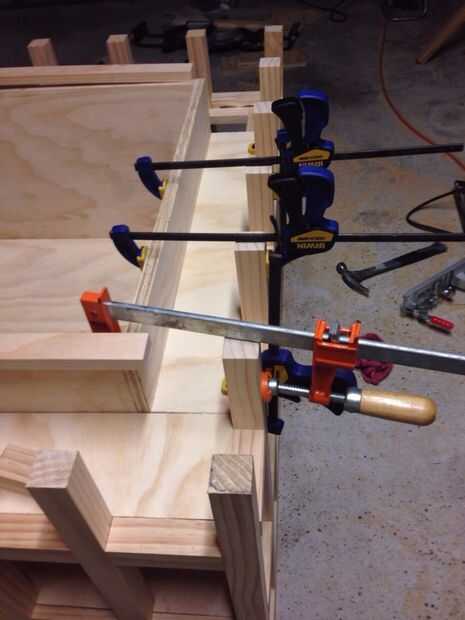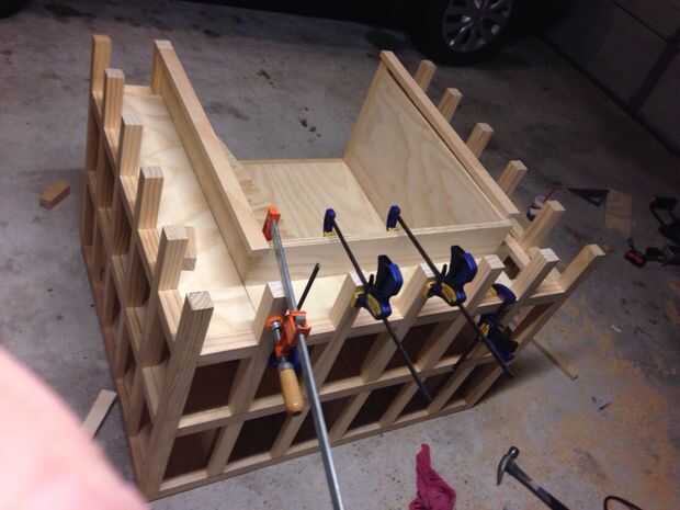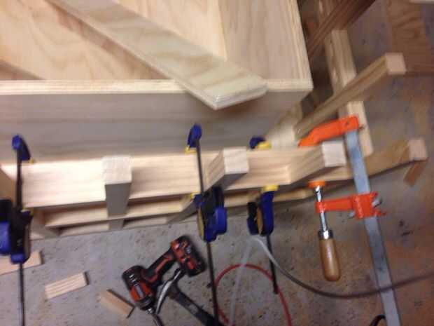 A continuación corte la madera contrachapada para llenar en el apoyo a los los mejores tres lados de la silla de la biblioteca. Como veis, usé pinzas para fijarlo mejor a la zona de asientos mientras seca el pegamento de madera.