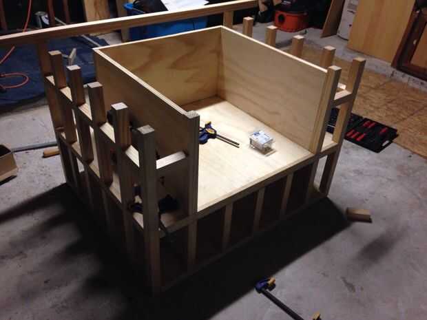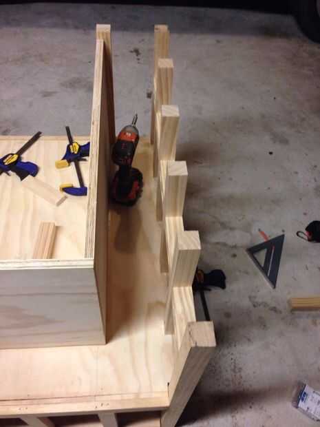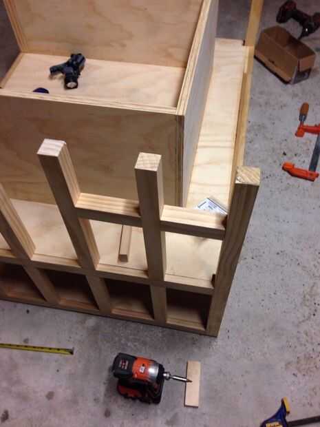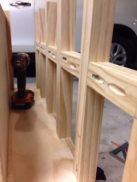 Closeup de tablillas de la biblioteca y cómo se utilizaron tornillos de bolsillo para bloquear cada pieza de 2 × 2 de pino entre sí.