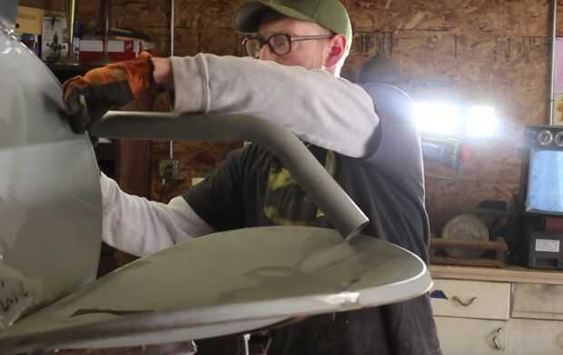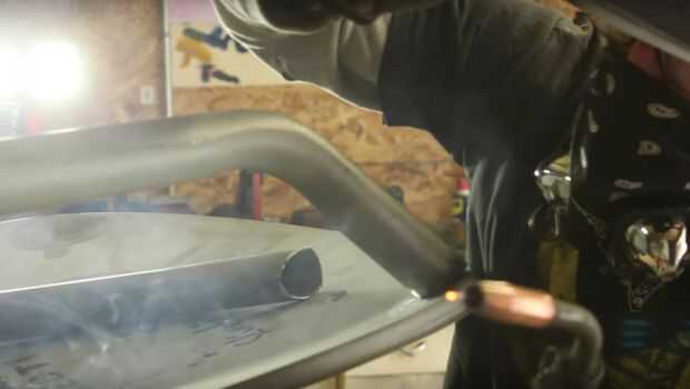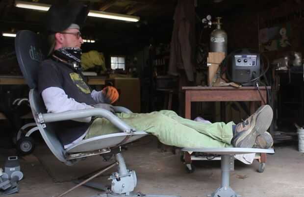 La parte doblada del poste de montaje de plato de satélite hace un buen reposabrazos. También añadió necesaria estructura para mantener la espalda y la parte inferior juntos y firmes. Mucho de ángulos compuestos hizo difícil conseguir limpia corta y las soldaduras de las costuras, así que para cubrir la fealdad, soldado un tubo abrazaderas de los platos sobre las articulaciones.