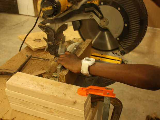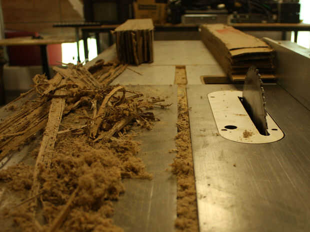 Una vez que ha secado el wheatpaste, cortar las tiras resultantes (nuestra era 3" de ancho) en la tronzadora. Establecer una parada para obtener longitudes constantes. El asiento contiene tiras de 20" de largo y la parte trasera es 14" de largo.