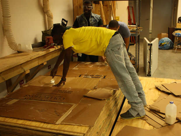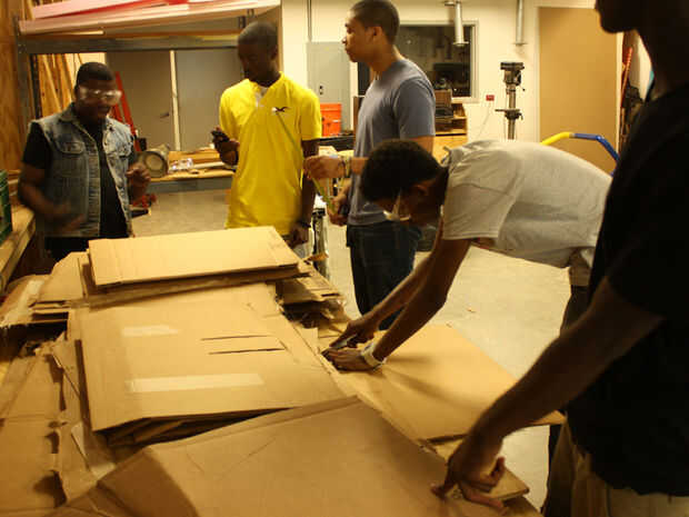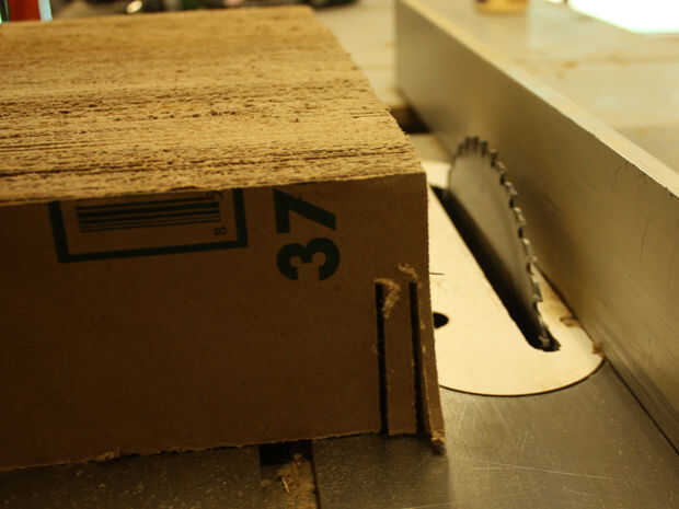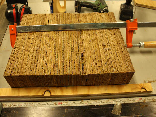 Hicimos el cartón laminado algunas maneras. Un método consiste en cortar tiras de cartón sobre la mesa vio establecer su wheatpaste sobre cada tira y luego juntarlos debajo de las abrazaderas. Otro método es pegar encima de láminas de cartón, Cargúelos abajo con madera contrachapada o similar, luego cortarlas en tiras más adelante en la tabla VI. Asegúrese de alternar el "grano" de cartón, colocando cada otra hoja con corrugación para máxima resistencia y estabilidad de la oposición.