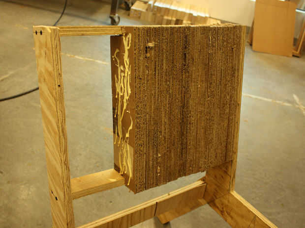 Poner las tiras de cartón en, ya sea como un bloque si usted previamente ha laminado con wheatpaste, o uno a la vez, colocar adhesivo entre cada capa. Una vez todos en, pop 4" tornillo en el centro de cada lado para tirar todo junto.