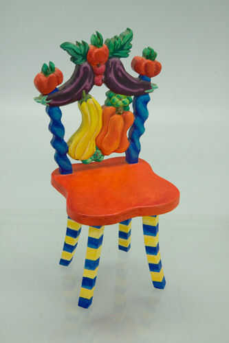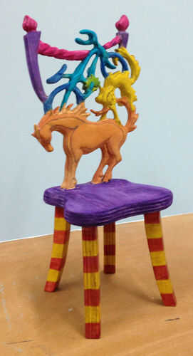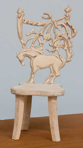Esta silla fue una boda para presentar un amigo mío. Está hecha de pedazos de madera, corte de madera contrachapada de 1/2 pulgada de calidad superior utilizando una sierra de contornear. Primero hizo un boceto, luego cortar las piezas y les pegan, luego mano había les había tallada y finalmente los teñidos con tintes de materia textil. El segundo presidente fue realmente el primero - que había hecho para mis padres y la novia había visto y admirado. Éste fue construido de la misma manera pero pintado con pintura de aceite.