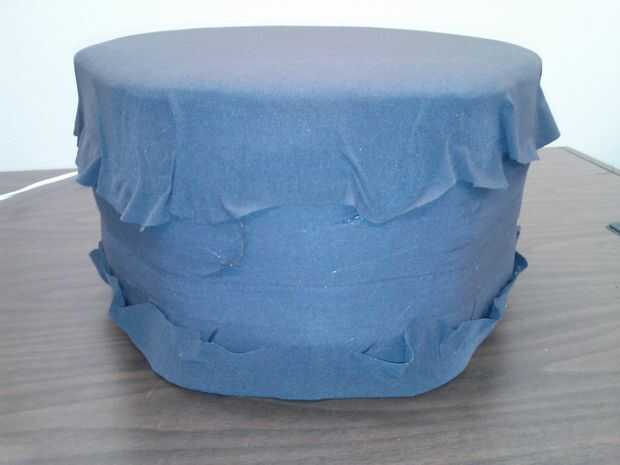 Corte 2 piezas de tela, 2" más grande alrededor de la circunferencia, uno para la parte superior y otro para la parte inferior. Coloque la tela sobre el bateo y el pegamento hacia abajo al lado, cerca del borde superior. Pegar otra pieza de tela en la parte inferior, pegar a los lados, cerca de borde inferior.