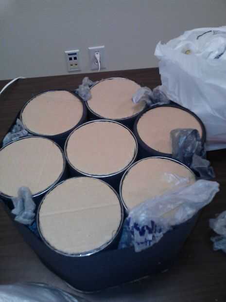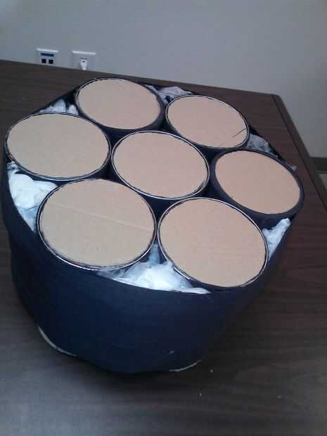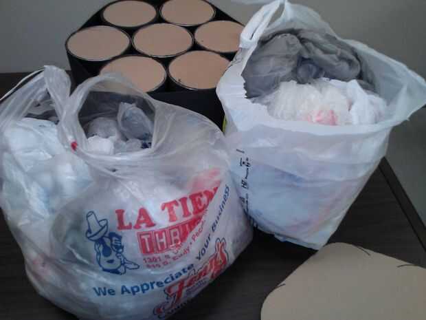 Colocar plástico varios en las aberturas en la parte superior de las heces entre las latas y tiras de tela. Empuje de tantos como sea posible en las aberturas. Pude colocar bolsas de unos 35 en las heces que hice.