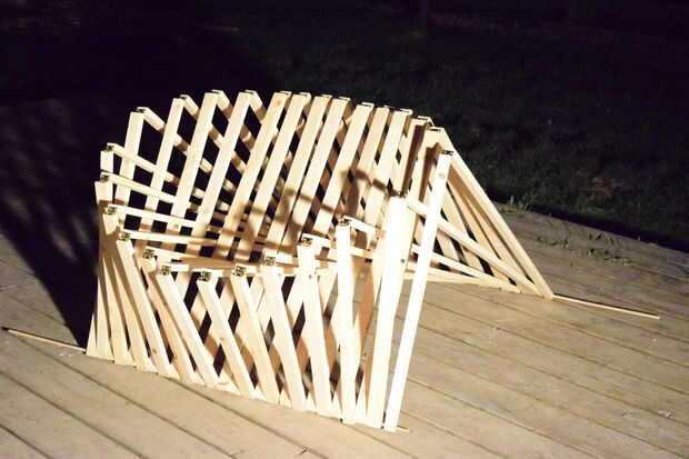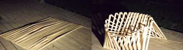 Es un sillón limpio que dobla totalmente plano, en lo que parece una pieza de contrachapado, sólo para convertirse en una única silla. La forma en proyecta sombras a menudo hace que su estructura algo intrigante y difícil de averiguar, y nos gustó. También, tipo de mira como una pieza de arte moderno o algo a lo largo de esas líneas jaja. Por último, lo hicimos en un solo día. Tomó cerca de diez horas.