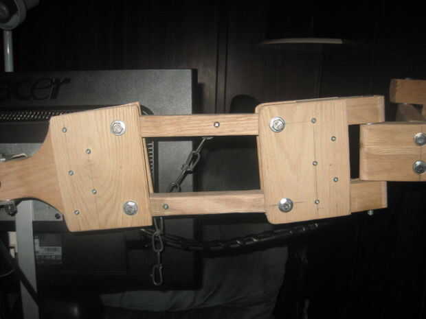 cosas bastante simple, es un pequeño trozo de cadena de perro que me permite ajustar el brazo verticalmente, he probado un cylender hydralic de un cierrapuertas primero pero no tenía la fuerza para soportar todo esto.