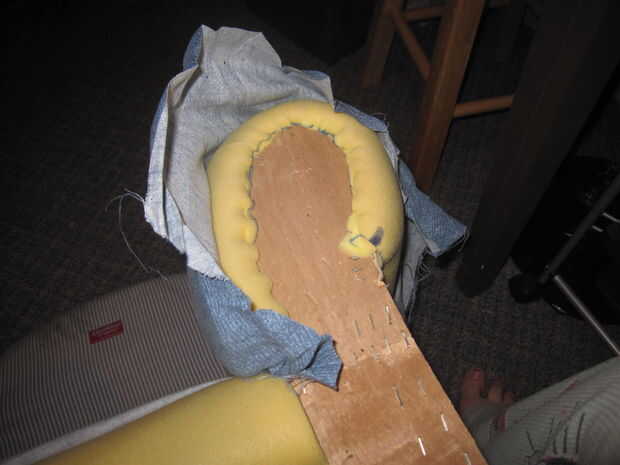 Salir de la pistola de grapas. Comience con el cojín. Grapa la tela del amortiguador a la pieza de madera se meta bajo la espuma. A continuación grapa la parte delantera de la silla. (ésos son los más simples)