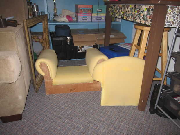 Ahora, para las piezas laterales. Coloque a la tela sobre la pieza del brazo y ajuste para asegurarse de que cubre el brazo entero y lado de la silla. Engrape a la tela a la madera con espuma en la parte de sentarse de la silla. También el frente (Estas grapas serán cubiertas por la pieza frontal madera ponemos en último) de la grapa y tire la tela hacia la parte inferior, deja una pequeña holgura para cuando alguien se sienta abajo en él, de la grapa para el bajo parte de la base de la silla. El resto de la tela de pieza del brazo será grapa una vez ponemos la pieza posterior en el marco de la silla base.