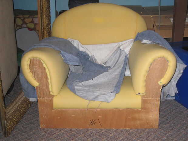 Retire con cuidado la tela vieja. La tela de la silla está en la sección 8. En primer lugar, comenzar con las piezas de madera en la parte frontal de los brazos. Generalmente, las piezas se lleva a cabo pedazos un par de clavos pequeños. Una vez que se quitan las piezas de madera frontales, voltea la silla. En la parte inferior, es con grapas la tela hacia abajo, empezar a quitar las grapas por destornillador de cabeza plana y un martillo.