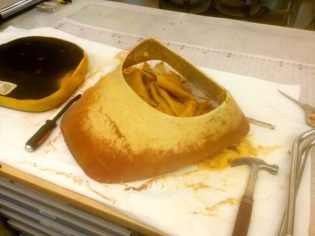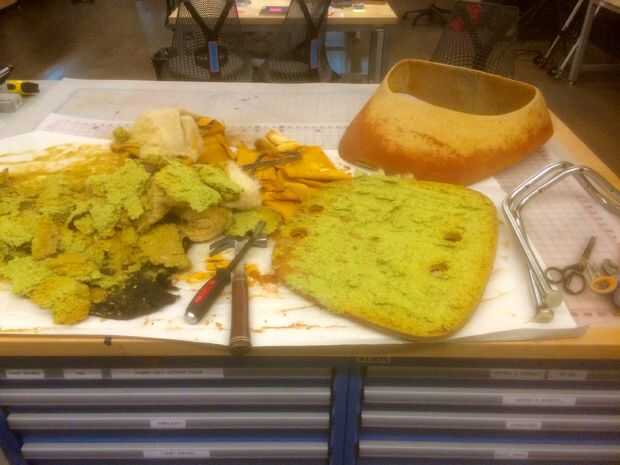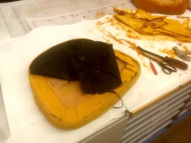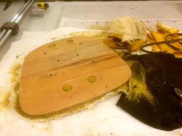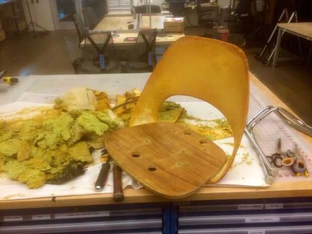 En cuanto al asiento de la silla, es otro nivel de maldad. Por debajo es este pegajoso verdoso suave de la espuma que raspar de la base de madera contrachapada. Esta madera contrachapada (me imagino de los años 60 o 70) es en realidad bastante agradable, y tan pronto como lo vi, imaginé mostrando de alguna manera en el producto final.