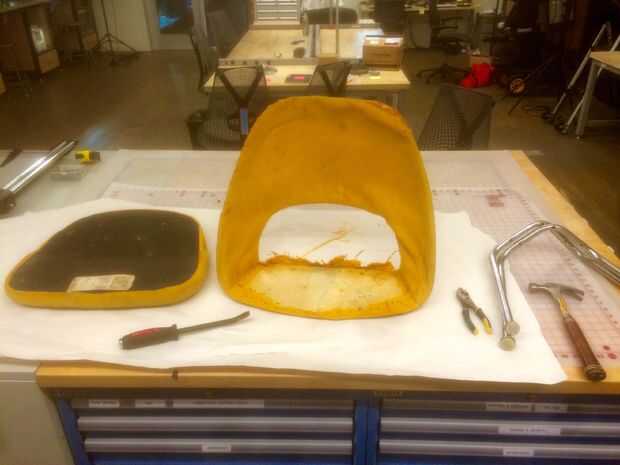 La tapicería exterior era desagradable, pero espere hasta que vea el interior! Parece que la espuma utilizada por debajo de la silla detrás había endurecido y se desmoronó en los años, produciendo este polvo amarillo super desagradable. La tela se realizó sobre la silla por estos pequeños clavos. Tuve que usar una herramienta de curiosos y el extremo curiosos de un martillo conseguir. Hacerlo en un pedazo de papel de estraza grande porque ese polvo espuma consigue por todas partes.