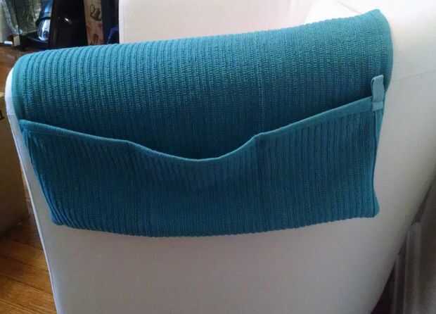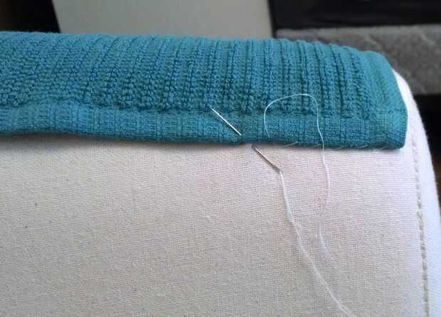 Una vez hecha la bolsa, coloque la toalla sobre el brazo de la silla y ajústelo hasta que esté satisfecho con el posicionamiento. Puesto que la silla era barata, cosí la toalla directamente a la tela del brazo con una puntada suelta. Si tengo que lavarlo, simplemente te corte los hilos y volver a coserlo. También se podría utilizar broches o velcro si quieres que sea más fácil de quitar.
