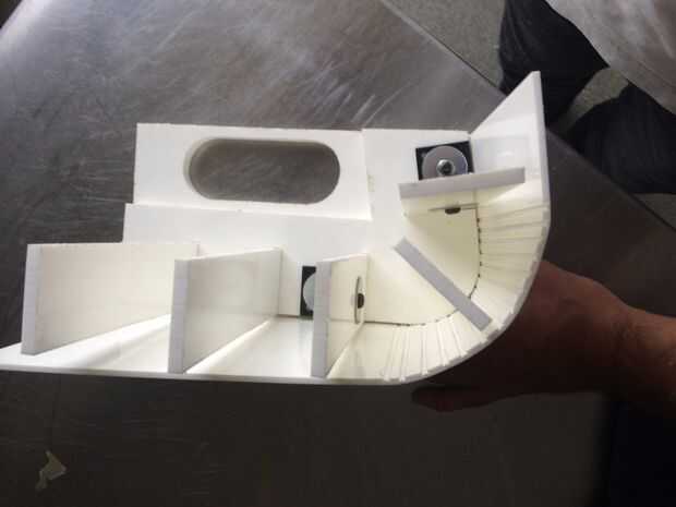 Doblar el plástico fue hecho con corte de flexión en que se quitan las tiras de material por lo que puede doblar. Es importante que el corte en el interior de la curva. Es está doblado al revés, encajará. Hice varias pruebas para obtener la profundidad adecuada y la frecuencia de las curvas de radio 2". Al final usé el ancho de una tabla de disco a 1/16" profundidad a que la hoja de 1/8 espaciada a 3/16". Te recomiendo la flexión más allá de la forma final, por lo que será más fácil de instalar en su lugar.