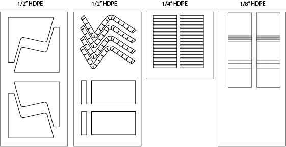 Una vez que la silla está modelada y dibujada, los componentes se arreglan en el material de la hoja 4'x 8'. En un esfuerzo por ahorrar material, las formas son dispuestas según el espesor del material entonces anidadas tan de cerca como sea posible. Algunas de estas formas puede ser cortado con una sierra de mesa, sin embargo las tolerancias para el perno agujeros guarnición puede lograrse a través de una operación de fresado automatizado mucho mejor. Para este proyecto he utilizado un estándar 4'x 8' ShopBot y hojas de 4'x 8'.