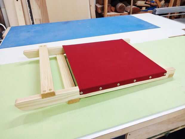 El respaldo se hace de una sola pieza de tela de algodón que fue cercado y luego atornillar en su lugar a la estructura de madera con tornillos de acero inoxidable y arandelas de acabado inoxidable.