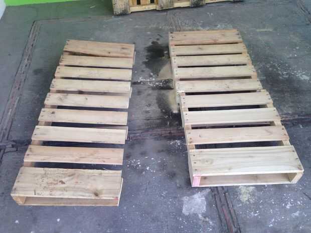 Una vez se cuenta con todo el material, se pueden cortar los palets con ayuda de la cortadora a las medidas se poder, estas pueden ser las se deseen, siempre y cuando la estructura de la tarima no pierda firmeza, esto para soporte bien el peso de una persona. En este caso, se cortó el Palet por la mitad, dejando el soporte central de la tarima para queden bien sujetas las tablas. Se corta de nuevo por la mitad para crear la parte será el Asiento y el Respaldo.En el caso del Respaldo, se corta en diagonal la parte será la unión entre el respaldo y el asiento, esto para hacer más cómodo el sillón.