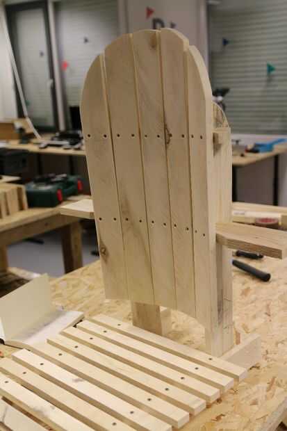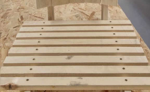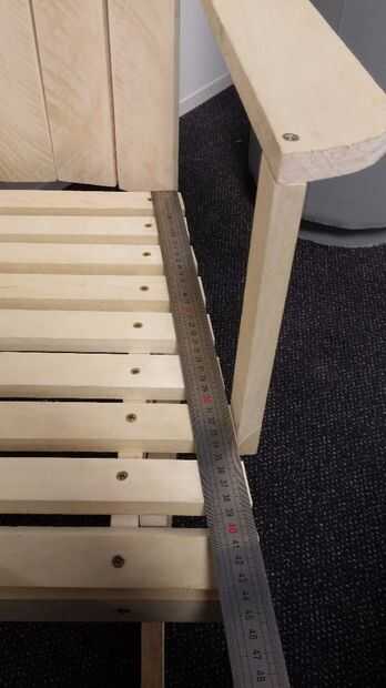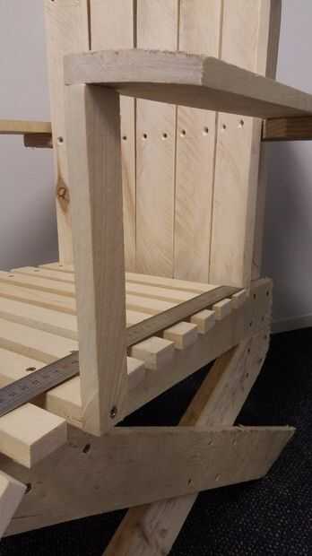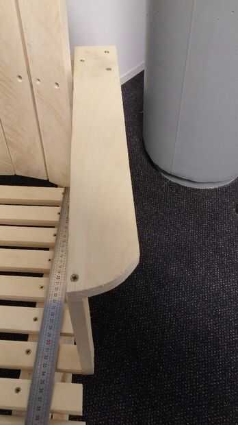 Añadir una pieza de madera (aproximadamente 45cm de largo) y sujeta a la ayuda con la estructura de respaldo (sabes que mantenemos este parte el tiempo suficiente para poder instalar el reposabrazos... Ahora es el momento de hacerlo ;))