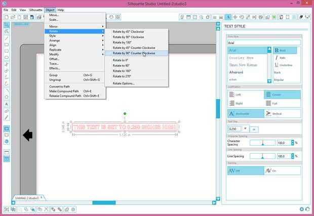 Clic en el dibujo un rectángulo. Dibujar un rectángulo alrededor del texto. Ahora queremos rotar el rectángulo para minimizar el uso de vinilo. Haga clic en el objeto-gira-gira por 90 contra las agujas del reloj como se muestra. Luego mueva el texto y la caja más cerca al borde.