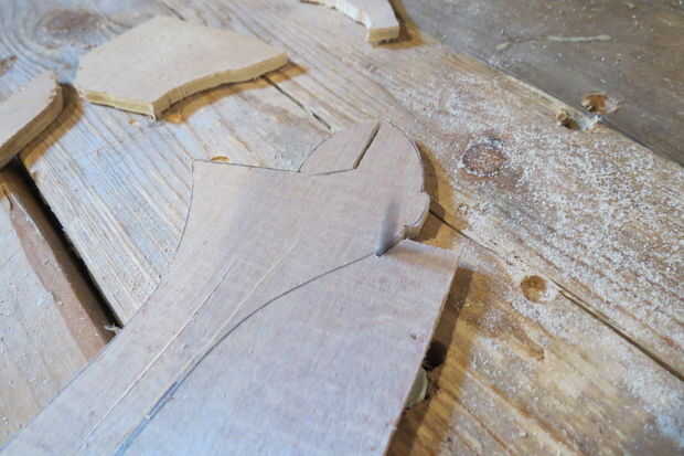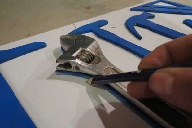 Después traza las formas de sus herramientas, ha cortado las piezas. Para ello, he intentado un número de métodos diferentes. La primera fue simplemente usar una sierra de calar como se supone para ser utilizado y esto resultó bien, pero encontré que la endeble madera contrachapada fina era difícil de sostener. El segundo método fue más exitoso y terminé usando para la mayoría de las herramientas: tomé el rompecabezas, dos orificios en la base y utiliza los agujeros para montar en la parte inferior de mi mesa de trabajo (esto era difícil de fotografiar, lo sentimos por el enfoque borroso). Fue mucho más rápido, pero tenía una tendencia a agarrar la pieza y el rebote de mi agarre. Por último, dio para arriba en eso y utiliza mi barato Sierra para cortar las últimas piezas