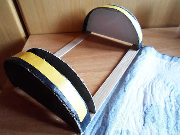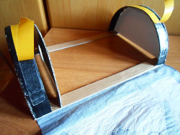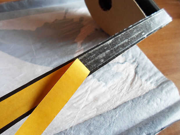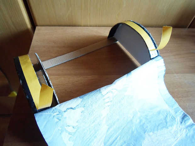 Invierta la estructura y añadir trozos de cinta de doble cara a la 2 tiras pegado a los semicírculos antes.