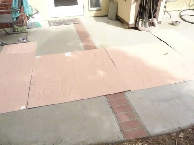 Utilizando un rotulador, traza el patrón en la parte posterior de la madera contrachapada. Todo el diseño es 12 pies de ancho y 6 pies de altura en los lugares más altos.