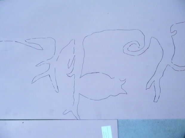 Dibujé el diseño en 8 1 / "2 del x 11" papel, entonces utiliza el método de la cuadrícula para agrandarla al tamaño adecuado, que dibujó en papel kraft y luego cortar. Podría, por supuesto, saltar el patrón y dibuja la ampliación (en reversa) directamente sobre la parte posterior de la madera contrachapada. O, si usted a pintarlo negro, se podría dibujar derecha en la parte delantera, como cualquier dibujos líneas serán cubiertas por pintura negra.