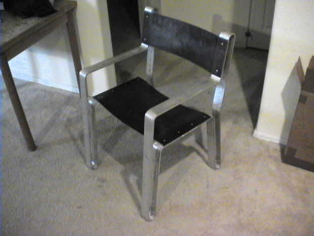 Si sigue la línea del marco que te darás cuenta que el asiento y respaldo son capaces de moverse independientemente uno del otro. El radio en los pies está actuando como la articulación. La tensión de ese apretado de un radio actúa como un resorte. Esto es en parte hacer con el material que utiliza. Los laterales están hechos de.25 x 2 6061 aluminio. Esta aleación tiene una memoria muy buena si está doblado frío. Los lados están doblados desde un dispositivo continuo de aluminio. Los dos extremos unen extremo con una soldadura en el centro donde está atornillado el asiento en. Después de un poco de pulido y pintura polvo no hay ninguna manera de saber donde comienza y donde termina. Los lados estaban decididos a una diacro , fue una hazaña para decir lo menos. tratando de conseguir la pieza en el doblador después de algunas de las últimas curvas era prácticamente imponibles. Puedo decir con orgullo que acertado la primera vez no una vez sino dos veces. La cosa más fácil del mundo es crear algo una vez, lo más difícil del mundo es coincida idénticamente.