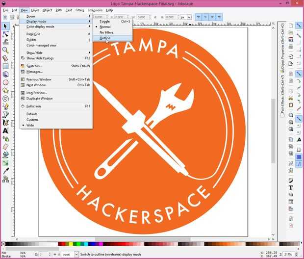 Inkscape puede exportar a DXF. Abrimos el archivo SVG con el logo de Hackerspace de Tampa en Inkscape. Hay un paso que debemos hacer aquí. Tenemos que verificar que tenemos vectores. En general, formatos de vectores permitirá imágenes empotrar. Tenemos que ver que nuestro logo es vectorizado y no una imagen incrustada. Para que tenemos a la vista de menú -> modo de pantalla y elija contorno. Si vemos un cuadro con una X a través de él tenemos una imagen incrustada, pero si vemos el esquema, tenemos vectores. Se puede ver en la foto de arriba tenemos un logotipo vectorial.