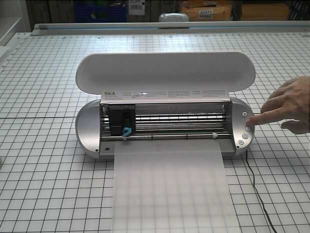 Corté un pedazo de vinilo 9 "x 9". Luego coloque el vinilo en posición para ser cargado. Asegúrese de tener un borde recto cuadrado contra los rodillos. No se muestra en la imagen, pero ayuda a ejercer presión suave con el vinilo contra los rodillos. Luego presione el botón de carga como se muestra.