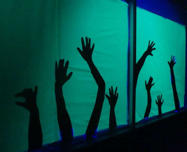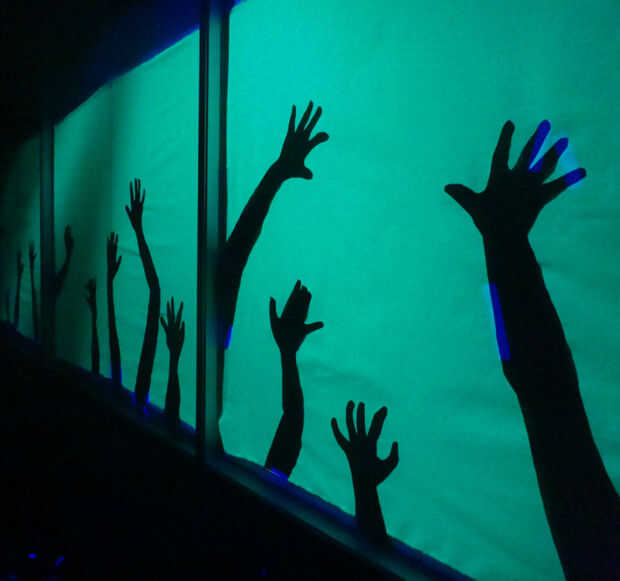 Hasta en el trabajo, que estamos armando una casa embrujada. Una de las zonas debían tener máscaras colgando sobre un fondo de tela que vino contra la luz negra. Por desgracia, las máscaras parecían grandes manchas negras.