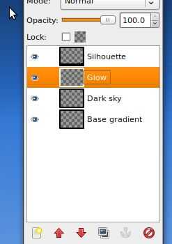 Crear una nueva capa (haciendo clic en el pequeño pedazo de papel con una estrella en la esquina), arrástrelo hasta la parte inferior, lo llaman 'gradiente base'. Permite obtener las capas de crear excedente y hecho con ¿vamos? Crear una nueva capa por encima de la base gradiente llamado 'cielo oscuro', y uno de eso llamado 'Glow'