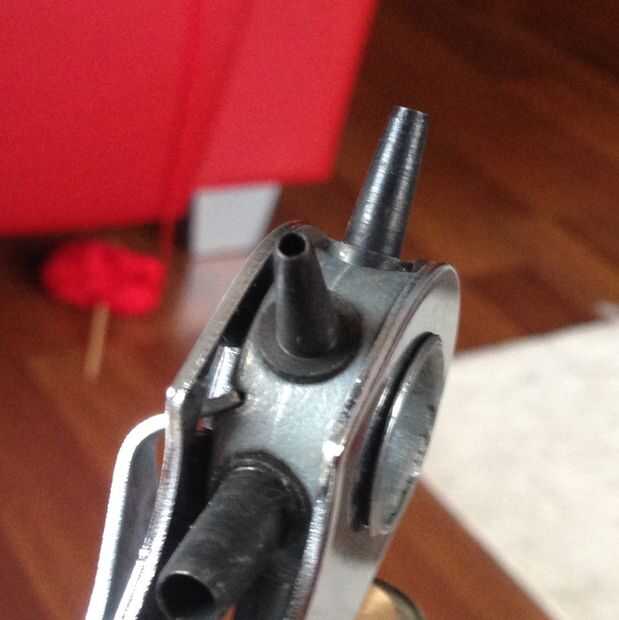 - En la parte delantera donde se superpone la correa debajo de la abertura, perforar un agujero a través del cual usted pondrá su stud de botón. Elige uno de los golpes más pequeños, quieres tu viga para permanecer en el lugar. Esta parte del cuero se tocarán la caja, y la otra pieza del cuero será una superposición de lo anterior.