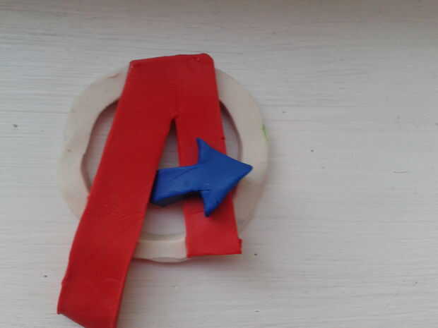 Para poner las piezas que ahora han cortado, juntos primero hay que empezar con el círculo blanco. Colocar el círculo y luego coloque la A rojo en el centro del círculo. Luego presione hacia abajo la arcilla roja que está sobre el círculo blanco. Esto hace que la arcilla se donde se coloca primero el lugar A. por último la pequeña flecha azul en el rojo A.
