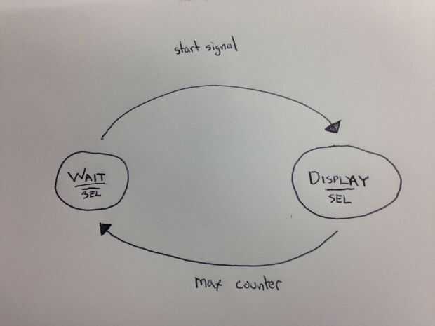 El FSM comienza en el estado de espera y una vez que se presiona la señal de partida, se movería para el estado de visualización para mostrar el patrón. Una vez que se generó la pantalla, el programa sería volver al estado de espera basado en el valor de contador máximo ser alta que transferiría entonces al segundo FSM que compararía el usuario de entrada a la pantalla.