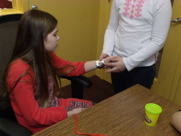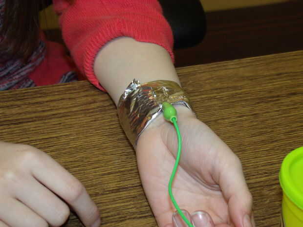Necesita el Makey Makey el conectarse a "Tierra". No queremos que mantenga el clip mientras jugamos por lo que tuvo un pequeño papel de aluminio y una pulsera. La pinza de cocodrilo a la pulsera de papel para completar el circuito. Jugar a manos libres!