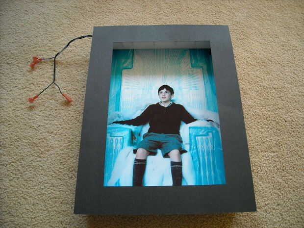 Los marcos se hacen de cartón cortado 2" de ancho para hacer un marco que es 12" x 16". He instalado tres LED blanco en 12" laterales de la carcasa y había instalado cuatro LED blanco en los lados de 16" de los marcos. El color LED se instala 1.25" de la parte superior de la cartulina de 2" de ancho. El color LED se encuentra más cercano a la imagen. He instalado seis colores LED en los lados de marco de 12" y 10 LED color en los lados del marco de la 16". Penetra los cables del LED a través del cartón y atado con alambre/soldado entonces en paralelo con la propia 471-ohm por el LED. Cubrí los cables que hacen de los bastidores de LED con papel blanco para cubrir los cables.