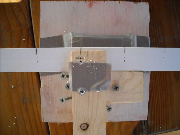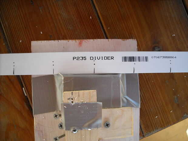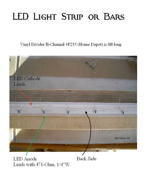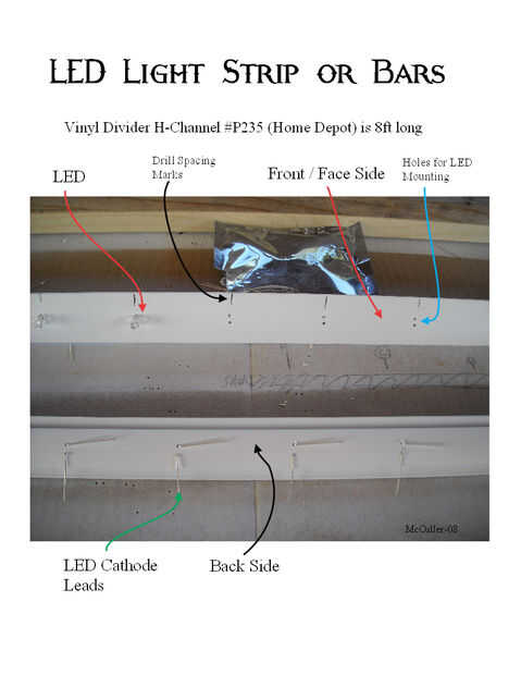 Los LED están espaciados cada 2" en el centro a partir 1/4 de final. He marcado cada ubicación de LED en la parte delantera del divisor de vinilo. Hice una plantilla de taladro de madera que es lo mismo que el LED llevan espacio. Que perforar los dos agujeros por el LED. He insertado el LED a través del lado de la cara plana del divisor vinilo y doblado el cable más corto (cátodo de LED-) para mantener el LED caigan. Envuelve cada cátodo LED plomo con el alambre de cobre pelado vendido 18awg a 22awg y soldado juntos.