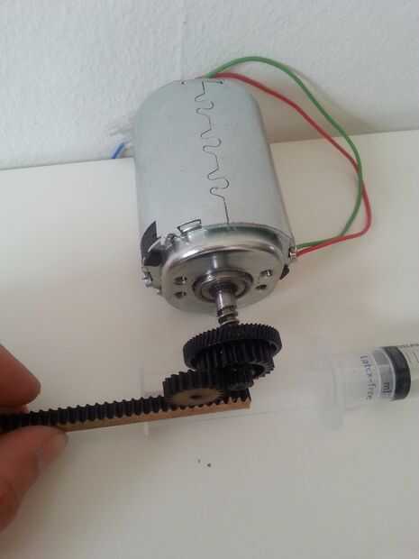 Ved en Brujas en motor de la c.c. og blandt andet et par tandhjul kan kranen styres uden en du selv skal trykke på sprøjten. Su er det importante en finde den rigtige udveksling. Princippet er en du skal Brujas et tandhjul lille fra motoren der går til et større tandhjul på pinden der er i forlængelse af sprøjten (se billedet).