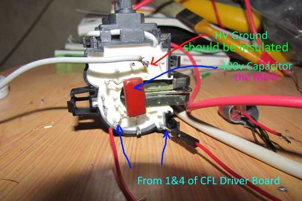 Mediante el uso de un solo componente puede aumentar la brecha de arco desde 1 cm a 1 pulgada. Si al conectar un condensador de 400V 245KJ como se muestra en la figura se incrementa el voltaje puesto Out. El secreto. Cómo siempre uso prolongado se calienta en el condensador.
