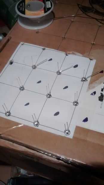 Con cinta la plantilla sobre un trozo de cartón y haga pequeños agujeros en él con unas tijeras en las juntas. Luego presione un led en cada uno para hacer los agujeros del mismo tamaño que un led, o si usted tiene un taladro y una broca de 5mm perforación.
