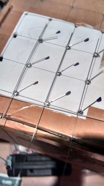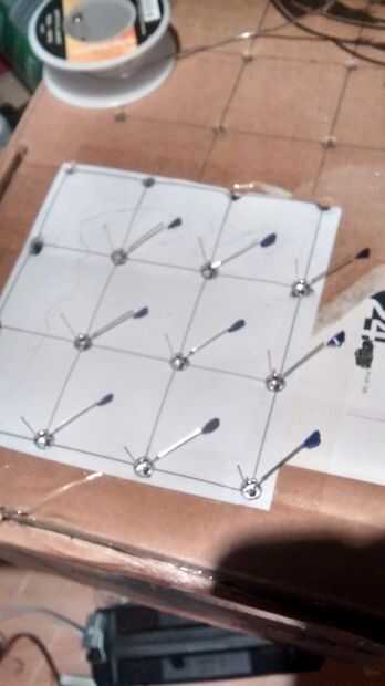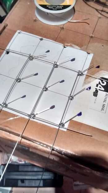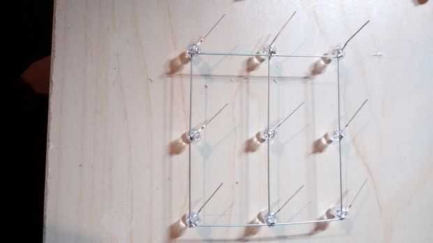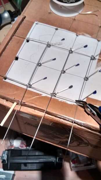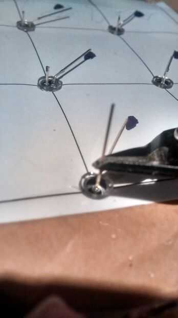 Una vez que se cortan las piernas pone una pieza recta del alambre puente a través de todas las patas en una fila que están en pie y soldadura en cada pata, hacen también para las otras dos filas. (Etiquetados Pic1)