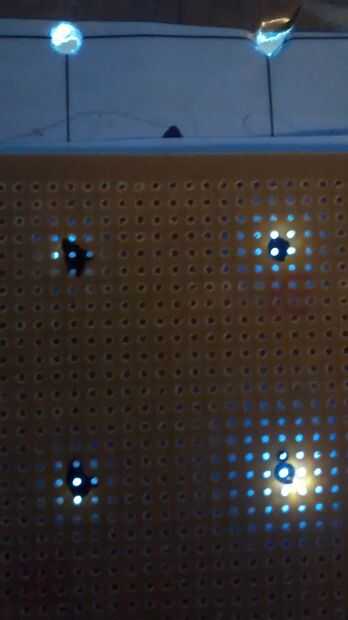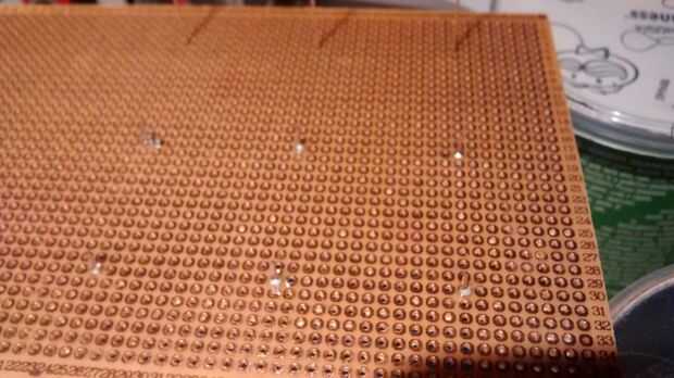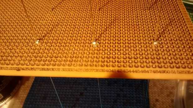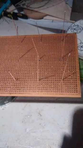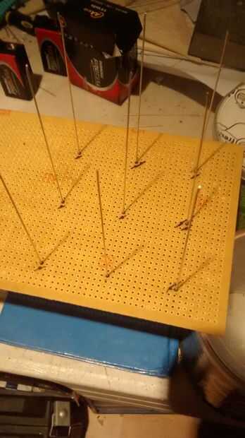 Para marcar donde las capas van a poner una luz debajo de la plantilla de cartón entonces la Junta en la parte superior para que la luz brilla a través de los orificios haciéndola fácil de marcarlos. Una vez marcados diapositiva un trozo de alambre por cada uno del agujero en el tablero manteniéndolo de pie recta y soldadura en el lado de cobre.