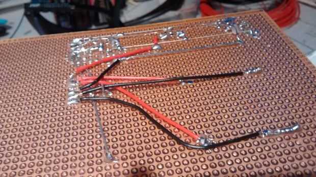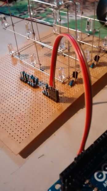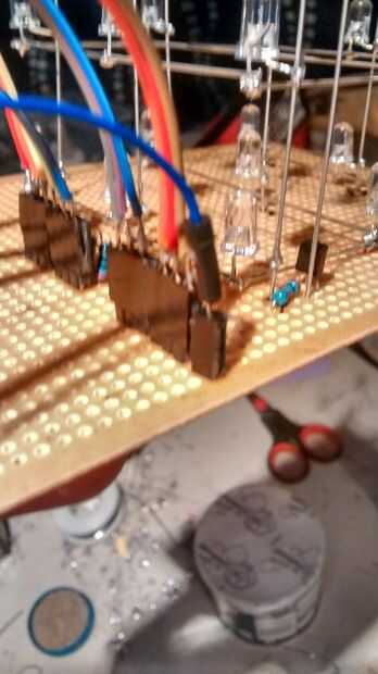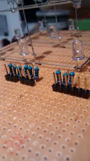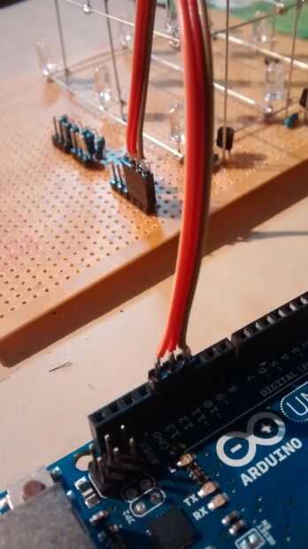 Cuando todos los cables están en un punto de soldadura de los cables (encabezado pernos o conectores) en el tablero para poder conectar al Arduino. He usado pernos de cabecera y hacer cables para conectar el cubo a un Arduino. Para que sea mucho más fácil conectar clavijas o enchufes a un cable aplicarán poco flujo de pasta a la clavijas o enchufes.