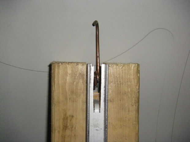 Tome una pulgada de ancho por 2 largo en el centro de la parte posterior de la Junta. Luego clavar un clavo a través de la parte. Twist de 6" de barra de soldadura sobre la uña. Corte una ranura para el gatillo en la pista.